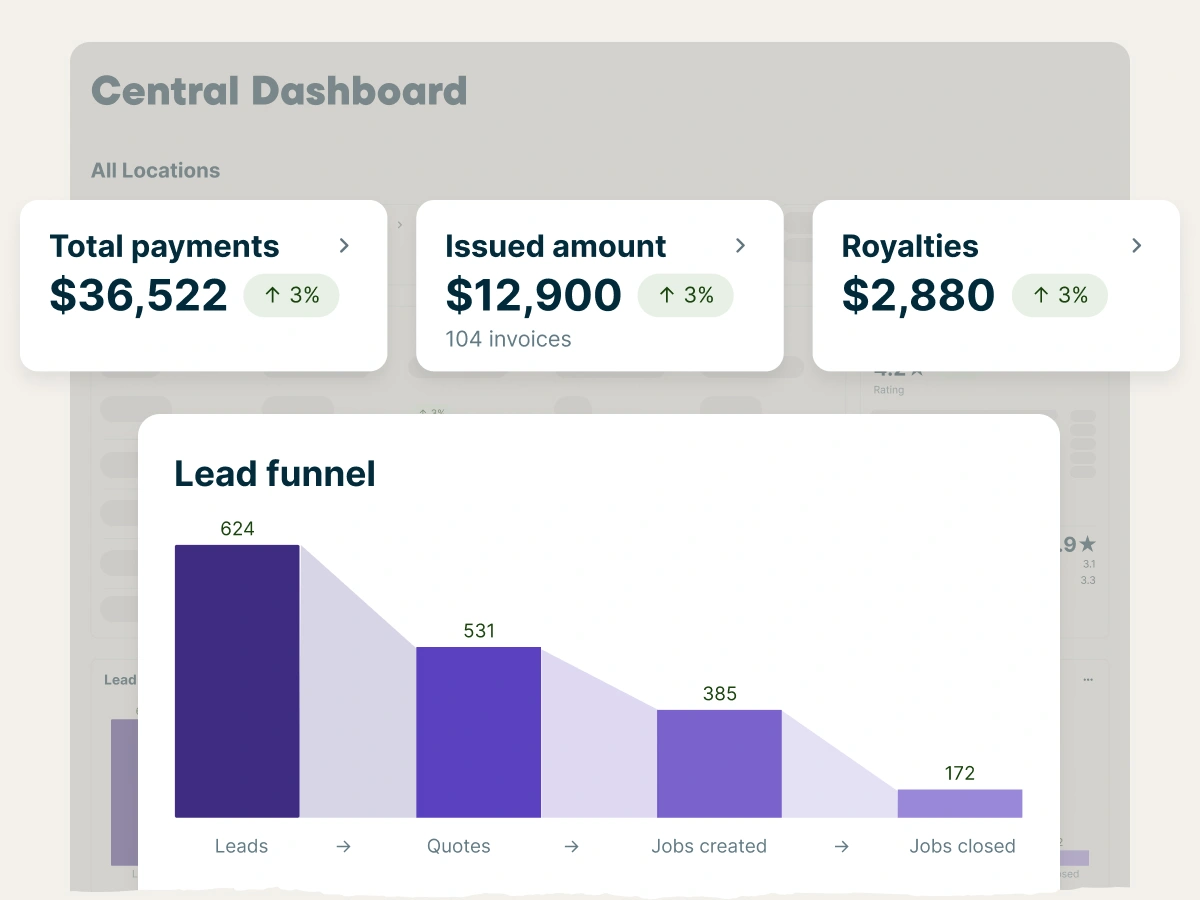 See real-time performance across every location with dashboards and reports that track jobs, payments, royalties, and reviews—all from a single login.