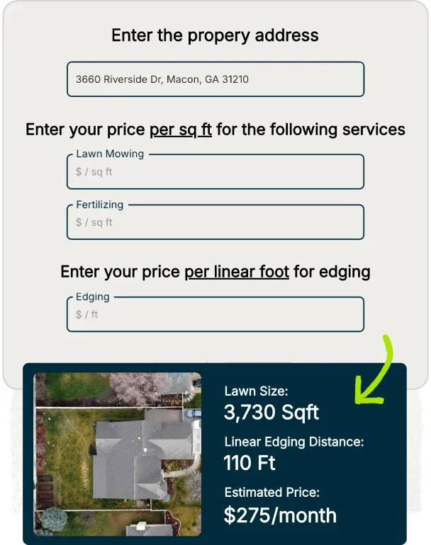 Manually measuring properties and quoting lawn care services takes time you don’t always have. When you need a fast estimate to qualify a lead or share a rough price range, this calculator helps you respond to customers more quickly.