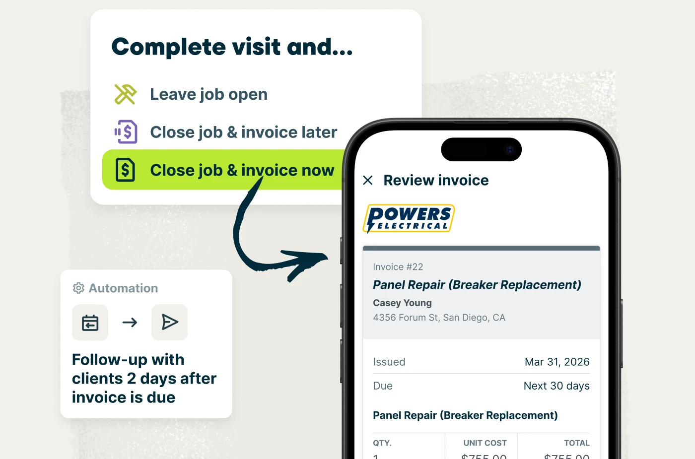 Create professional invoices from the field in one click, whether you’re wrapping up a service call or finishing an installation. For larger electrical projects, use progress invoicing to set payment schedules upfront tied to job milestones. Automatic follow-ups help you collect payments faster and maintain steady cash flow without awkward money conversations.