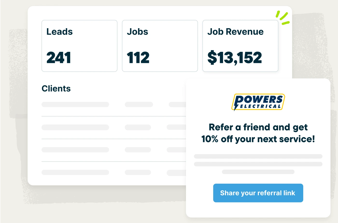 Happy customers are your best source of new work. Track and manage referrals in Jobber and reward customers for spreading the word about your electrical business with discounts or promotions automatically applied to future jobs.