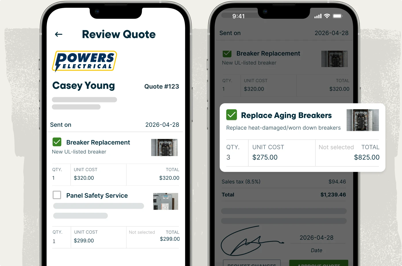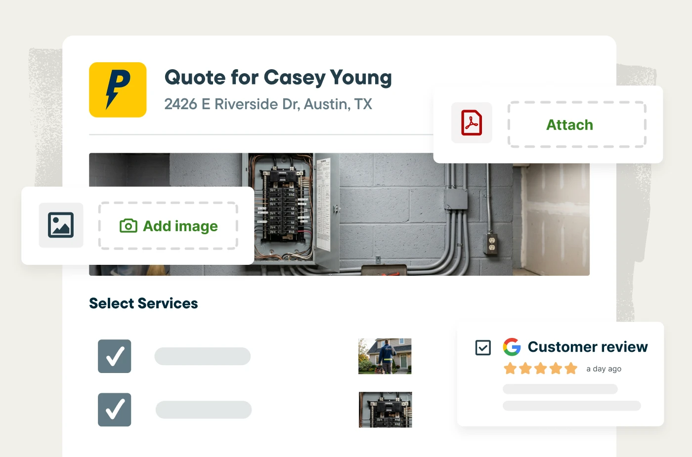 Upsell without the ‘hard sell’ by offering additional electrical services right in the estimate, like surge protection, dedicated circuit installs, panel upgrades, or safety inspections. Customers choose what they want, and the quote total updates automatically, making approval quick and easy.