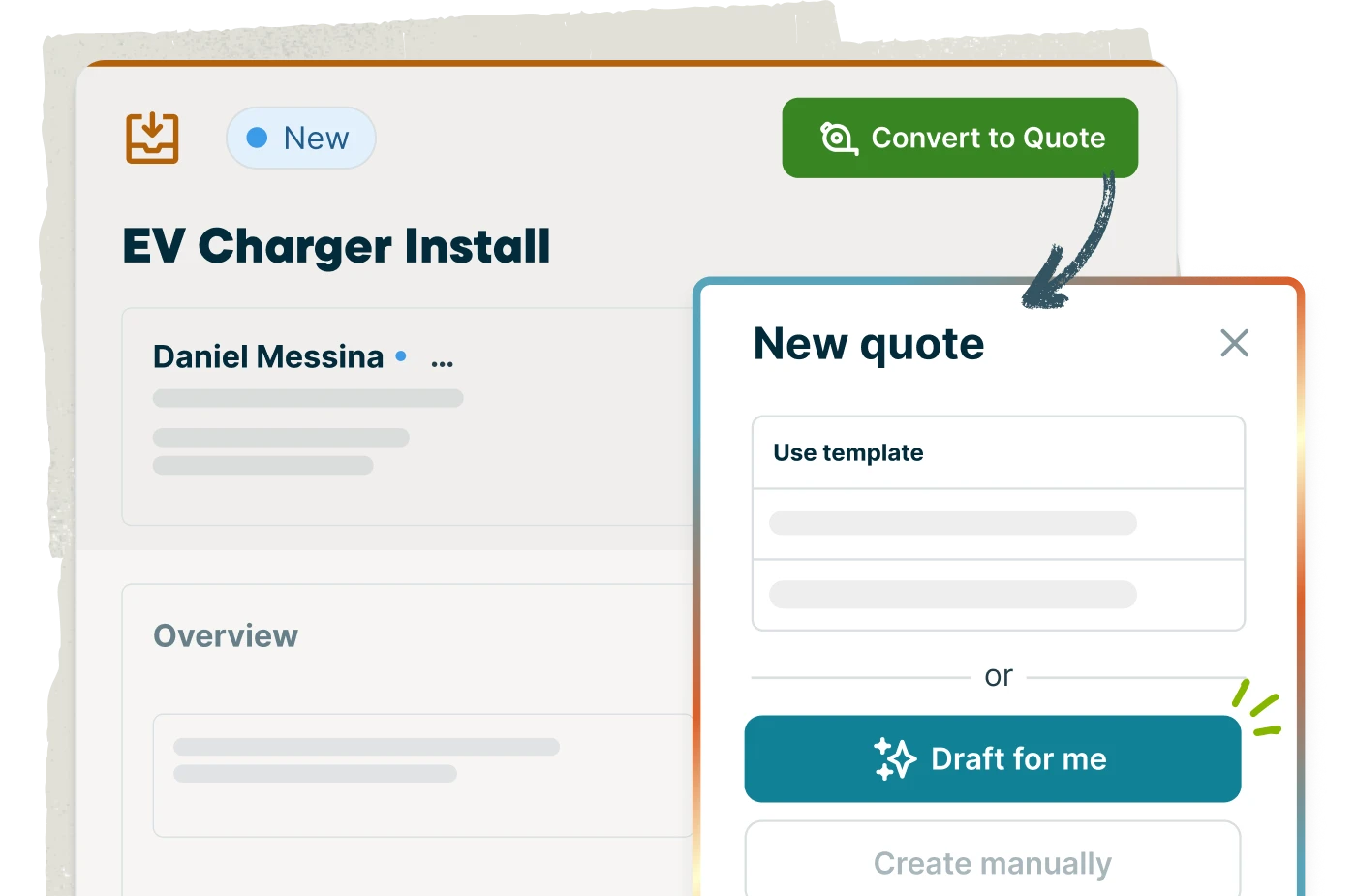 No need to start every estimate from scratch. Jobber AI can draft detailed quotes using information from past electrical jobs, giving you a fast track to create, review, and send estimates in minutes. Reusable templates are also available in the Jobber mobile app so your electrical team can build and send professional estimates from the field.