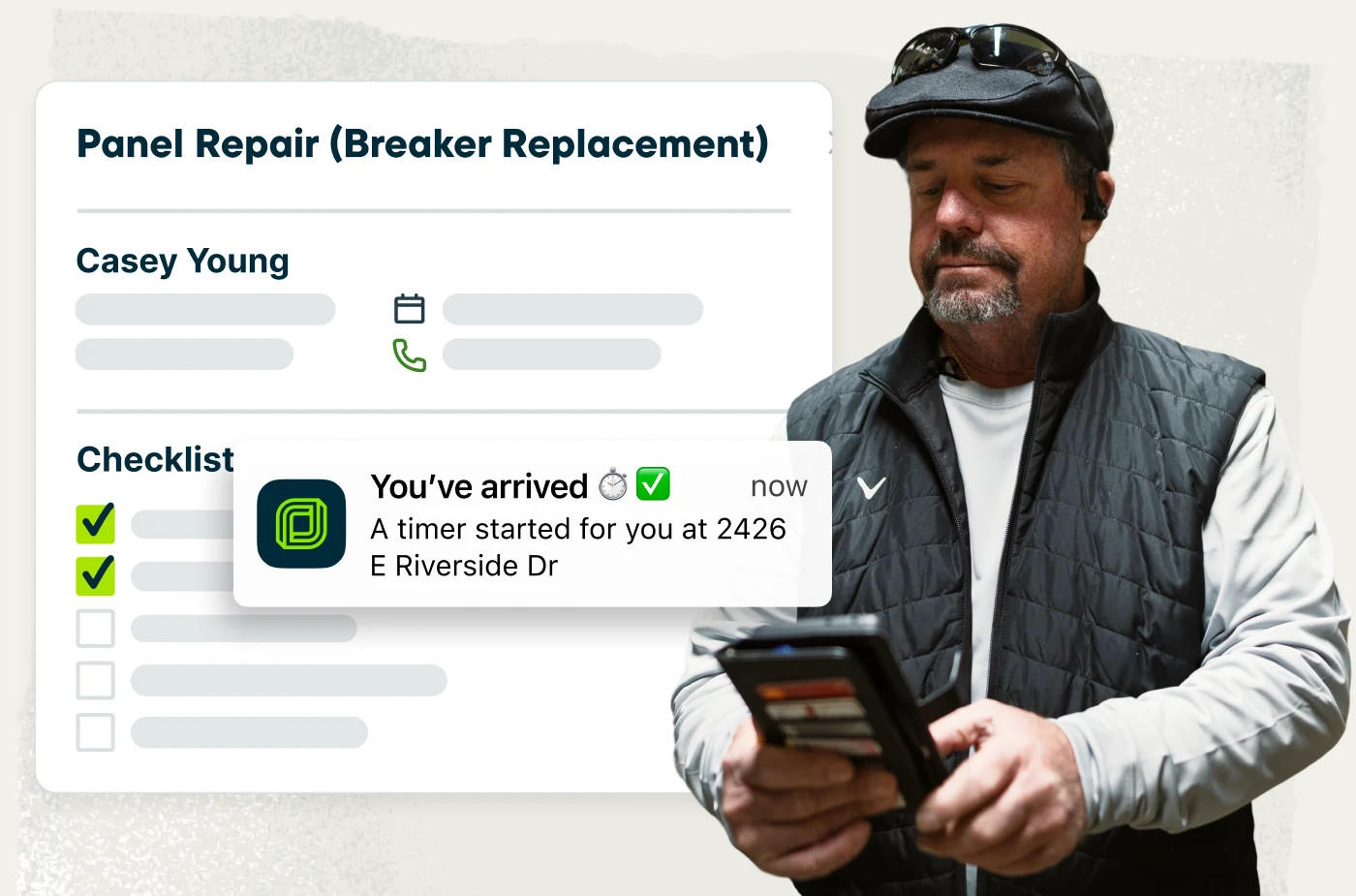 Give your electricians the tools they need to deliver great on-site service. Jobber’s top-rated mobile app gives them access to their daily schedules, essential job details, checklists, photos, and time tracking, all from the field in real time, eliminating the need for constant calls and texts to you or your office staff.