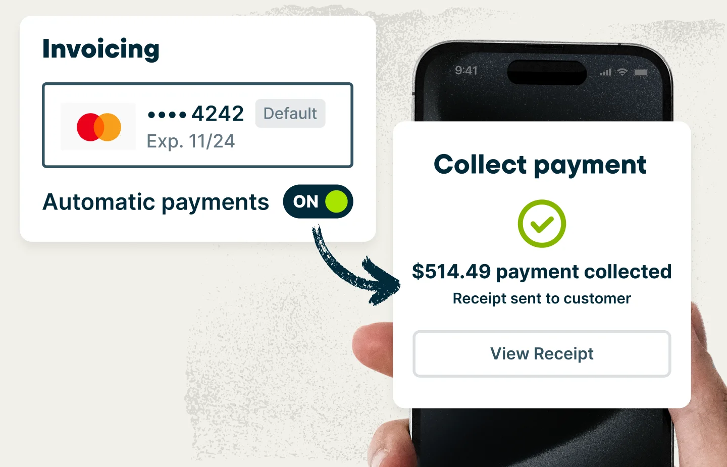 Invoicing and payments are built in, with batch invoicing, automatic payments, ACH transfers, credit card payments, payment schedules, and Tap to Pay—so you can invoice faster and get paid sooner.