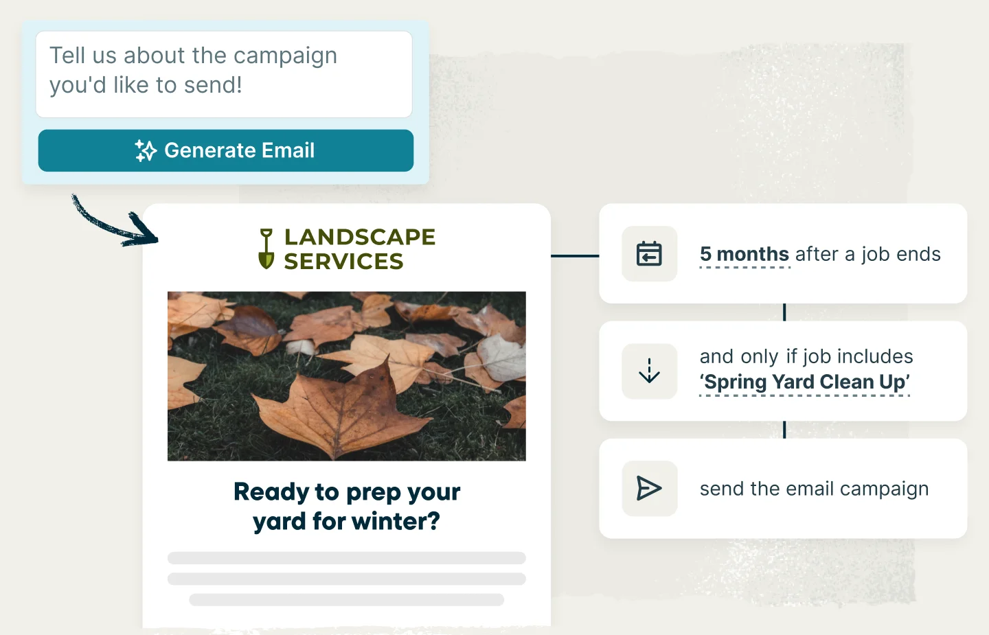 Jobber’s Marketing Suite keeps you top of mind with clients by re-engaging them with send seasonal reminders or thoughtful promotions. Emails are drafted for you, and campaigns send automatically based on what’s happening in your business.
