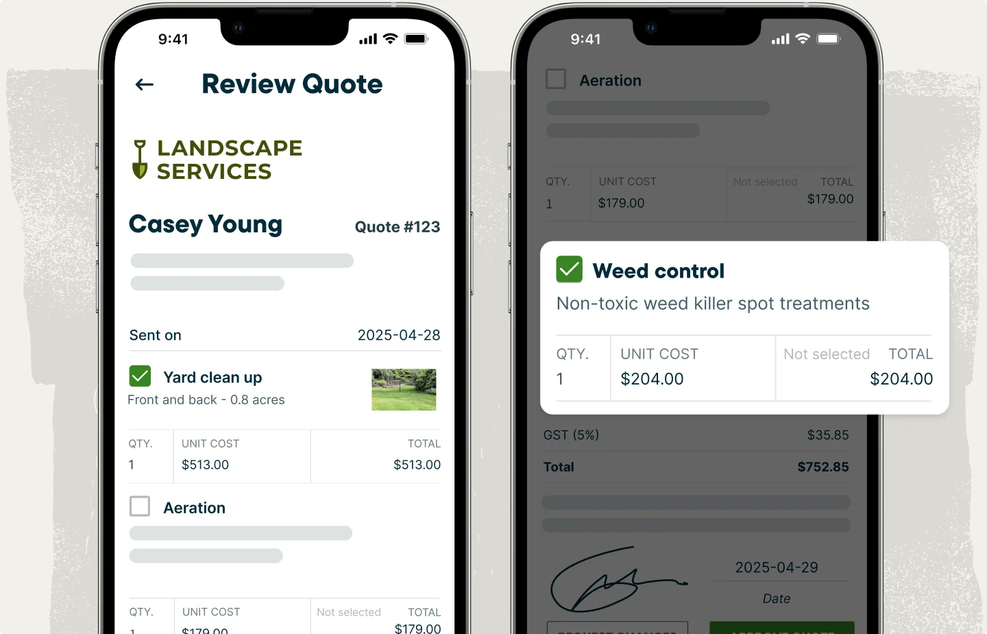 Upsell without the ‘hard sell’ by offering additional services right in the quote—like mowing, aeration, irrigation, weed control, mulching, fertilization, or seasonal cleanups. Customers choose what they want, and the total updates automatically, making approval quick and easy.